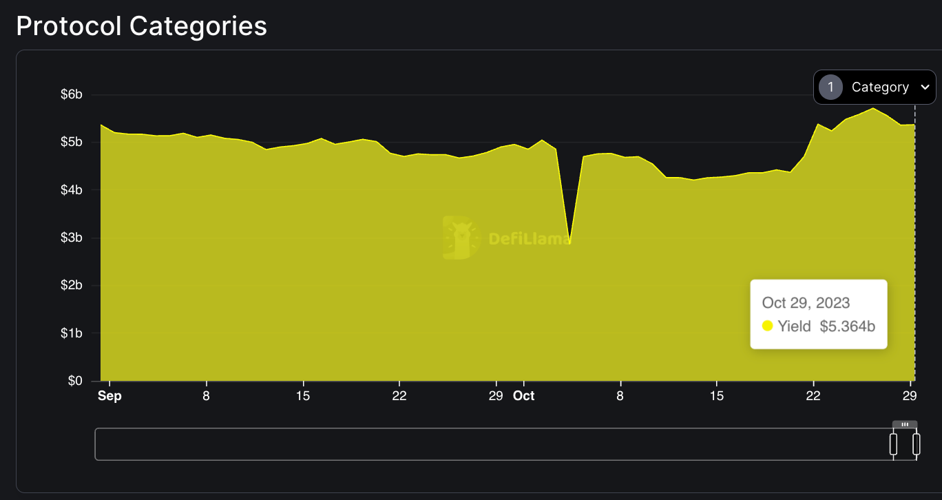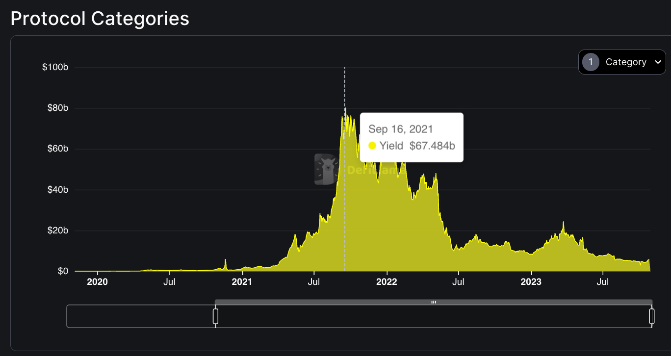 At the peak of the bull in 2021 we saw the yield category amassed a TVL of $67 bil, thats 10x from where we are at now