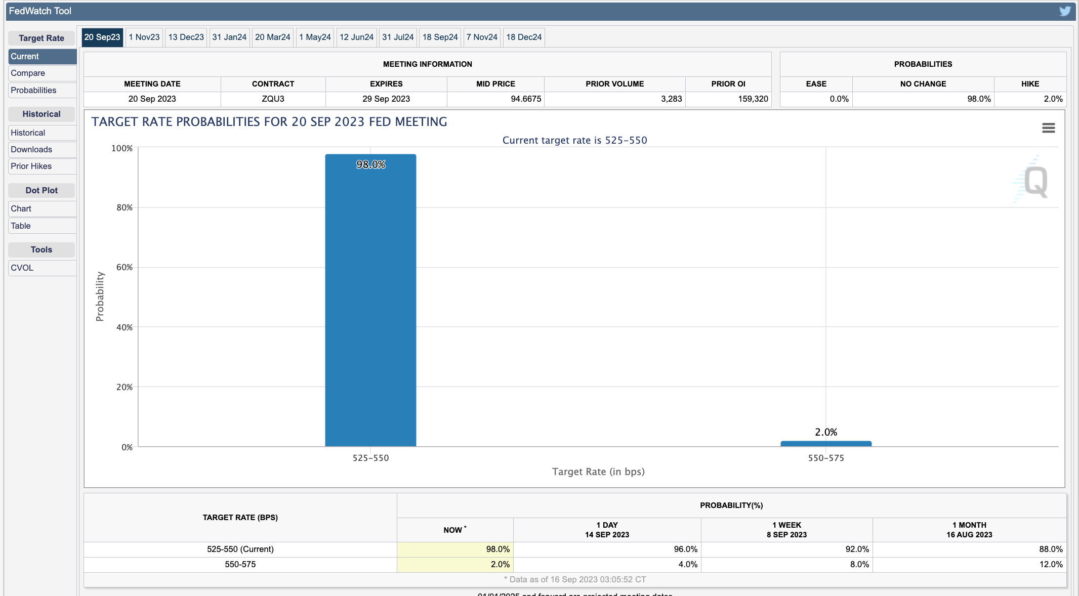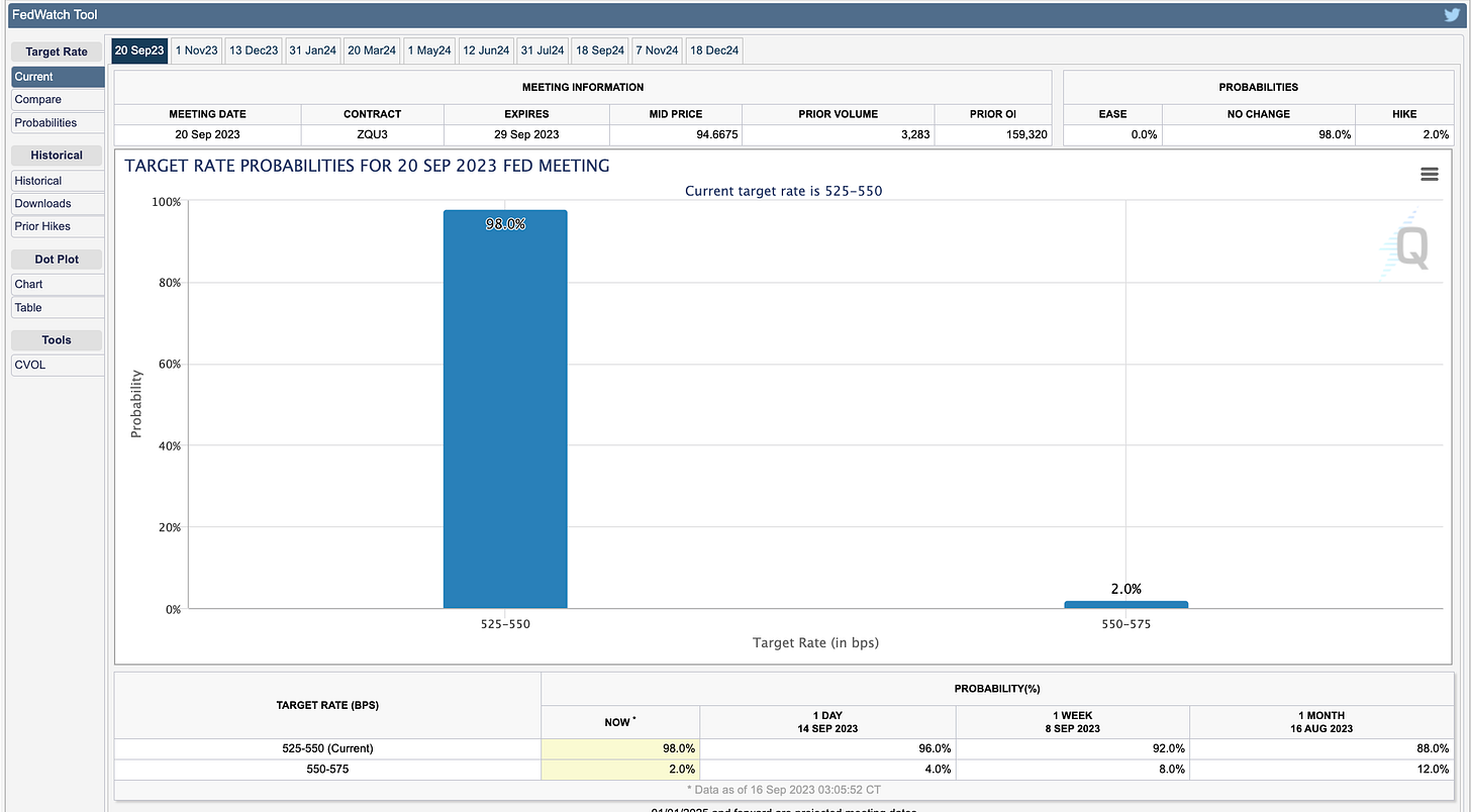 Expect no change to current target fed funds rate range of 5.25-5.50% at the September 20-21 meeting.