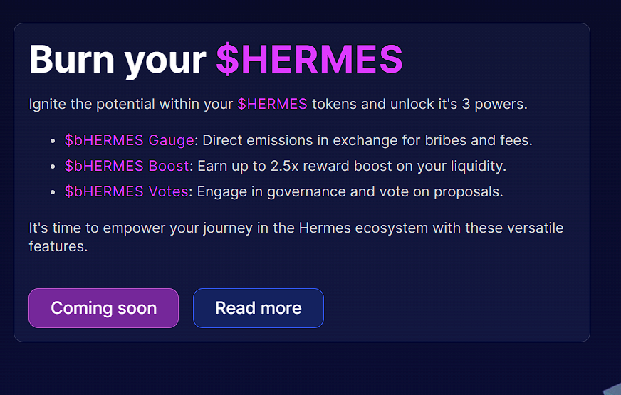 Users now burn $HERMES to obtain bHERMES, which supports three utility tokens: bH-V for governance, bH-G for bribes and fees, and bH-B for boosting liquidity rewards.